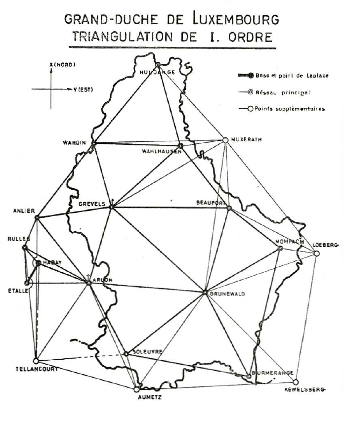Le système de référence LURES trouve son origine en 1930 avec la mise en place de la triangulation du Luxembourg exécutée par l’Institut Géographique Militaire de Bruxelles. Il en résultait, entre autre, un réseau de triangulation de 1er ordre, illustré ci-après :
